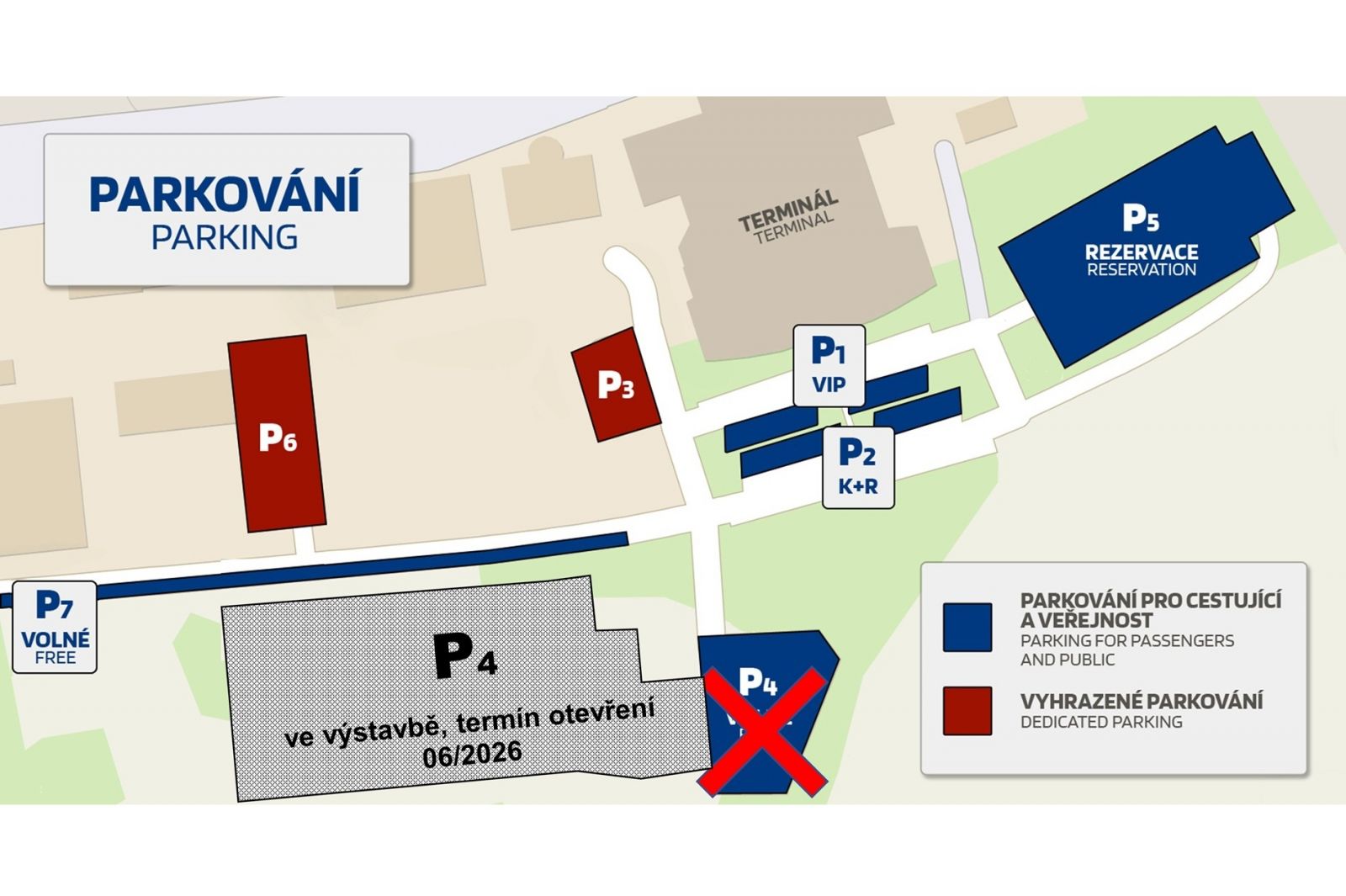 Výstavba nového parkoviště, které ponese označení P4, znamená uzavření stávajícího starého parkoviště P4, které aktuálně slouží pouze pro účely stavby a poté již nebude fungovat v režimu parkovací plochy. Letiště oproti stávajícímu stavu získá 107 nových komfortních parkovacích míst, která si cestující budou moci předem rezervovat pro krátkodobé či dlouhodobé stání. Kromě nového parkoviště P4 bude ve stávajícím režimu dále fungovat parkoviště P5 (za Gagarinem), které je na rezervaci a zpoplatněné. Volné bezplatné parkování bude nadále možné podél celé příjezdové komunikace – parkoviště P7 s kapacitou cca 80 stání.